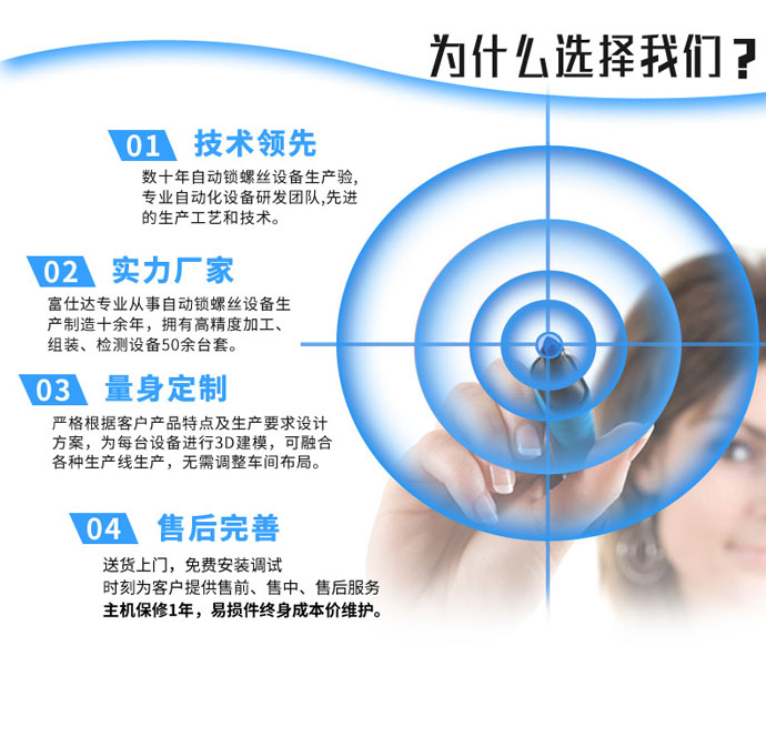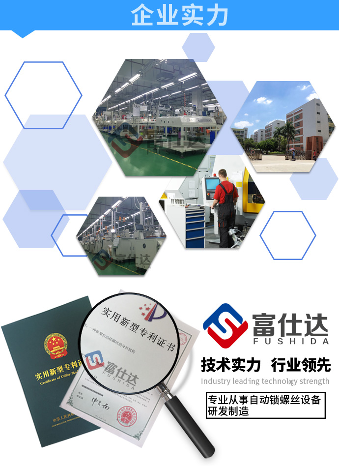 富仕達(dá)擁有獨(dú)立研發(fā)設(shè)計(jì)團(tuán)隊(duì),200多位自動(dòng)化高級(jí)工程師,5000㎡自動(dòng)鎖螺絲機(jī)生產(chǎn)、測(cè)試車間,專業(yè)售后服務(wù)團(tuán)隊(duì),為客戶提供方案設(shè)計(jì)、設(shè)備制造、操作培訓(xùn)、售后服務(wù)等一站式服務(wù)。 公司將持續(xù)提升技術(shù)創(chuàng)新和產(chǎn)品服務(wù)方面的優(yōu)勢(shì),堅(jiān)持“專業(yè)、精工、服務(wù)”的企業(yè)理念,聚焦于自動(dòng)鎖螺絲設(shè)備生產(chǎn),通過(guò)系統(tǒng)的一站式解決方案,真正的幫助客戶提升效率、降低成本,提升客戶的核心競(jìng)爭(zhēng)力。