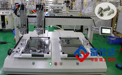 我司采用的是雙平臺坐標式自動擰螺絲機設備。如圖所示,用的是圓頭十字螺絲,雙平臺的設置可以放置2件產品,配備4臺高精度伺服電機,只需要一名作業員上下料,便可輕松完成整個鎖付工序。